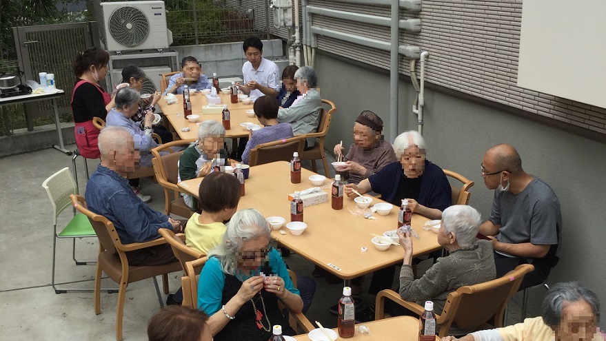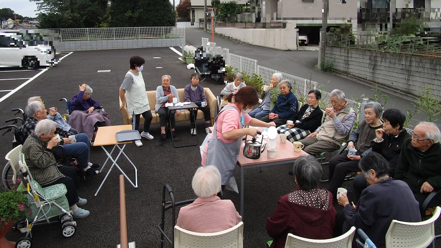 外気浴を行いながらご利用者さま全員で「おやつ」を食べるようにしています。