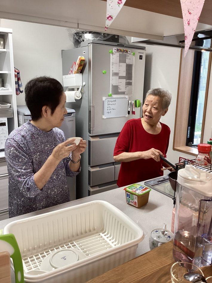 また食事作りでは、ご利用者さまの得意なことを活かし、調理、盛り付け、洗い物など分担しながら行っています。先日、こんな事がありました。「ちょっと味見してくれない?」「おいしい!」