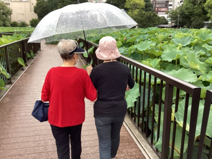 先日、お出掛けした上野にある「不忍の池」では、あいにくの雨模様でしたが、お二人だけで歩いて頂き、スタッフは後ろからそっと見守っています。