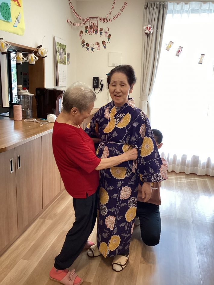 またある日、スタッフが持参した浴衣を協力して着付けて下さいました。
