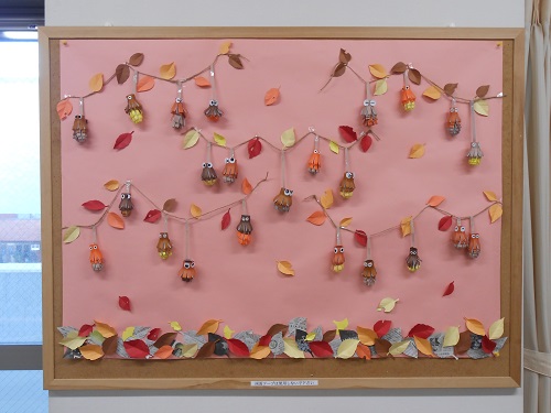 11月はミノムシと枯れ葉の作成。12月はクリスマスリースを作成中です。