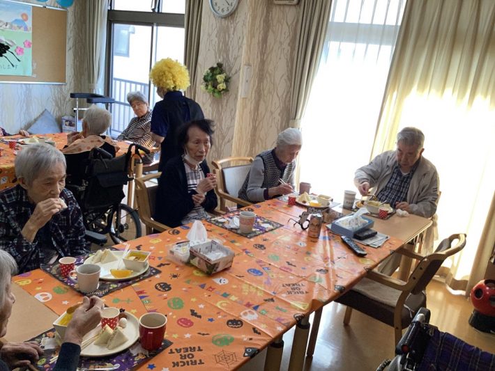 10月31日はハロウィンイベントを行いました。ご利用者さまにはスタッフと同じ仮装をしてもらい、ビンゴゲームをしたり、おやつにハロウィンドーナツを召し上がって頂いたりしました。