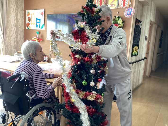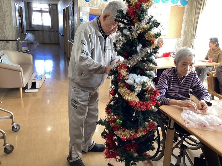 もうすぐクリスマスのため、ご利用者さまとクリスマスツリーの飾り付けを行いました。