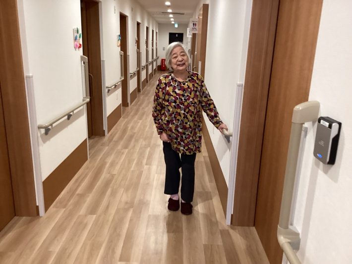 以前利用されていた施設では車いすの生活を送っていた方も、日常生活の中で歩く機会を確保し、スタッフが安全に配慮しながら行う事で、歩行器を使用しながらですが、ホーム内では車いすを使わず歩いて生活されております。今では表情も良くなり、発言が増えたように感じています。