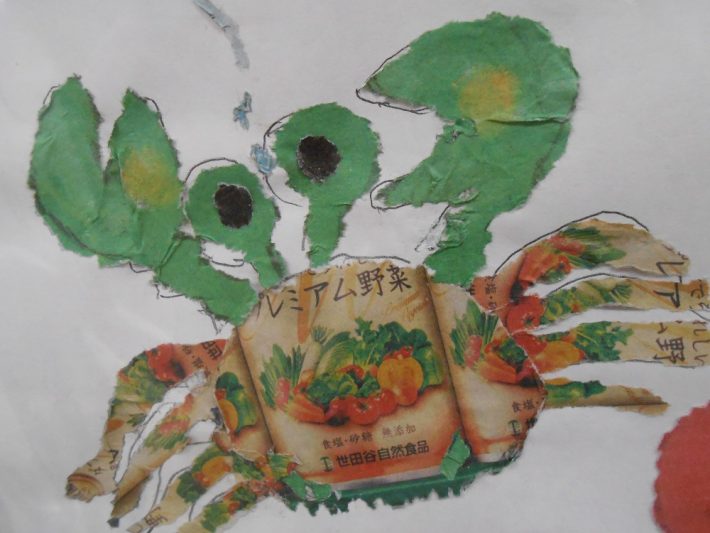 カニの甲羅に「野菜」の文字。