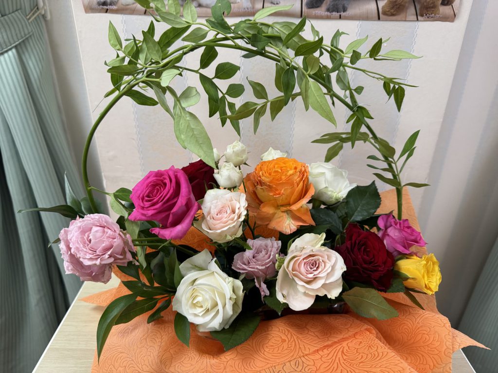 1時間以上かけて見事に完成したフラワーアレンジメント作品を眺めながら笑顔が止まりませんでした。