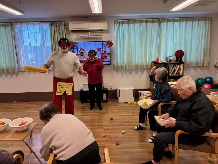 先日、はなまるホーム東浦和では節分行事として、豆に見立てた柔らかいボールを使った「鬼退治レクリエーション」を行いました。