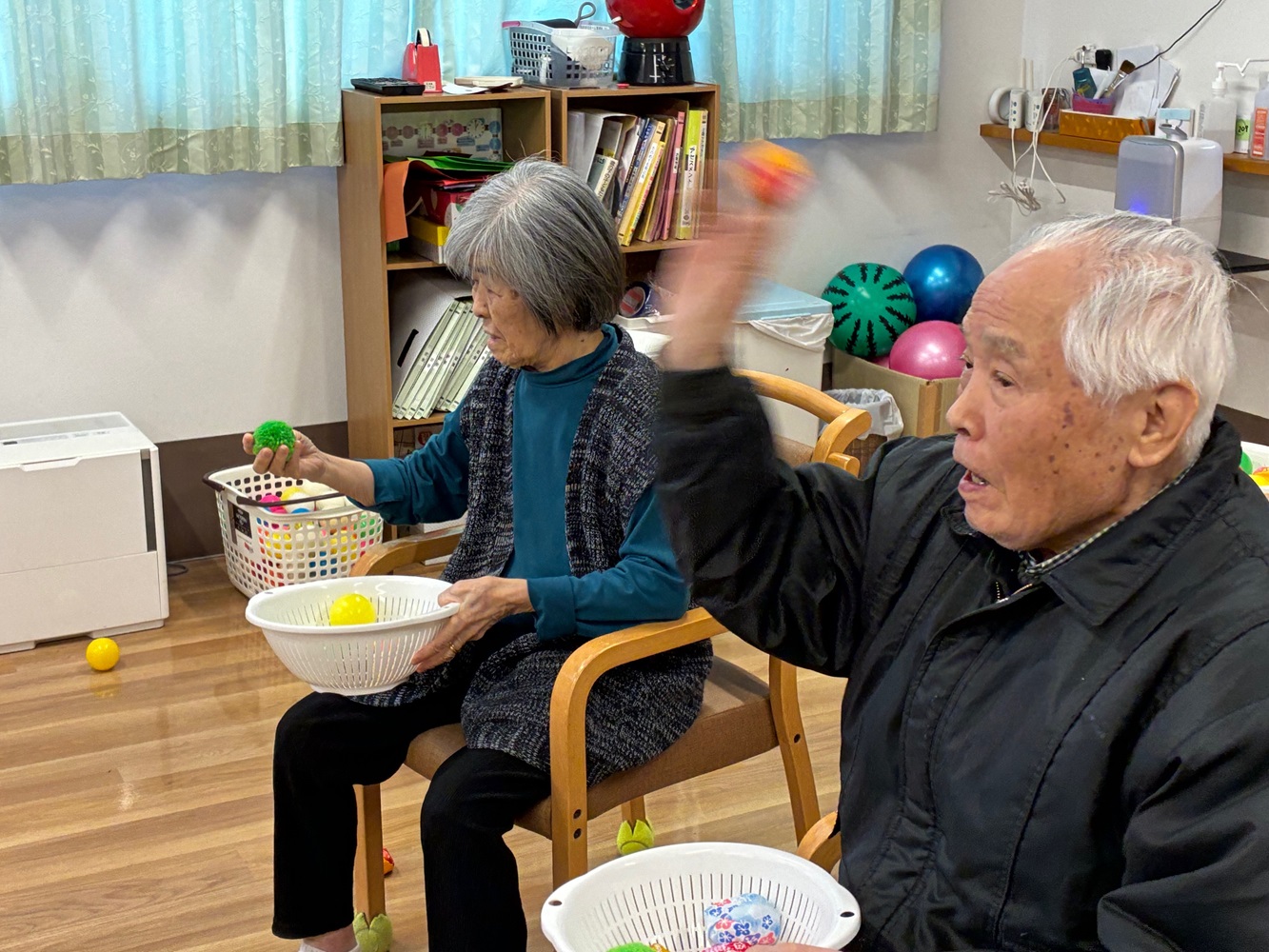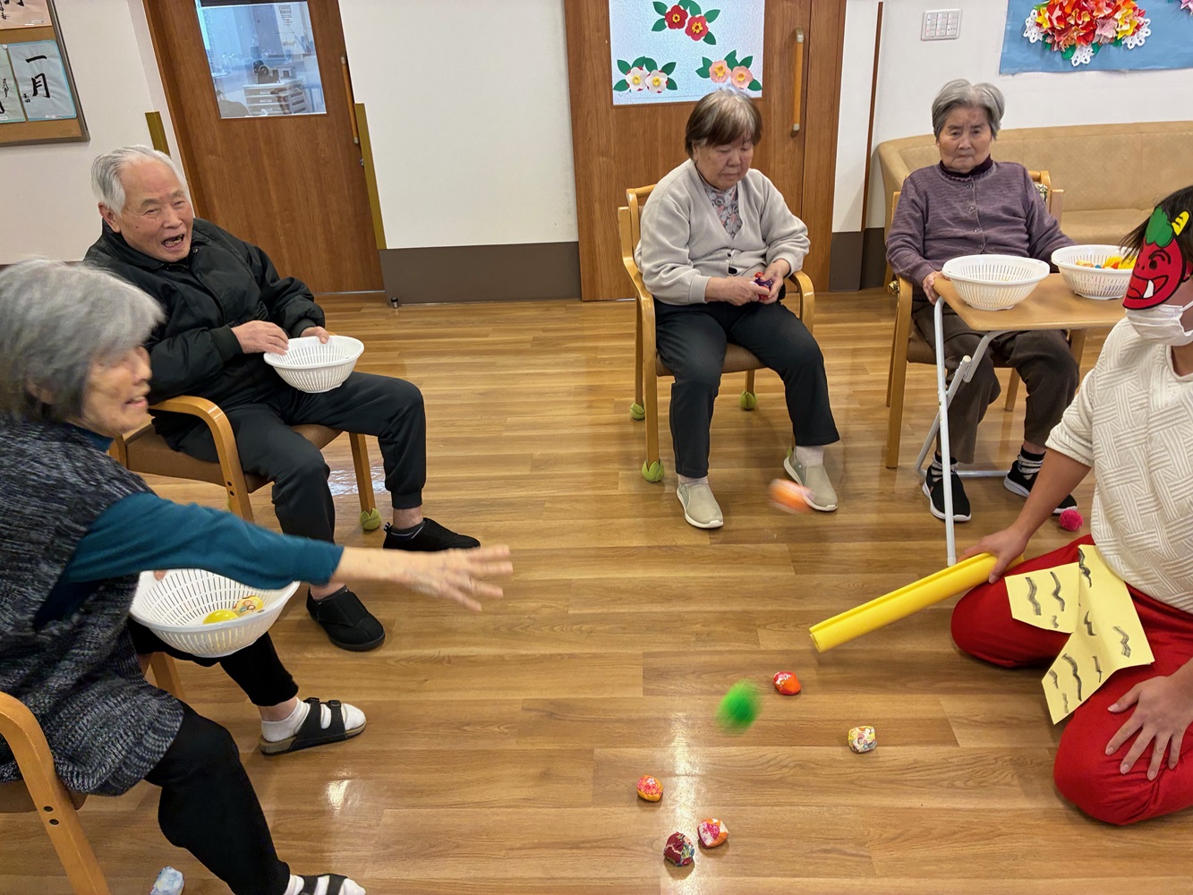 先日、はなまるホーム東浦和では節分行事として、豆に見立てた柔らかいボールを使った「鬼退治レクリエーション」を行いました。