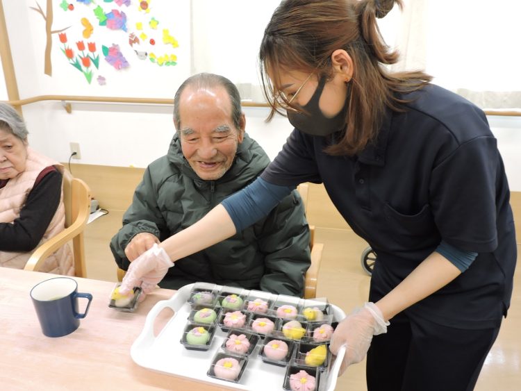 ひな祭りイベントでは、おやつに春らしい練切をご提供しました。