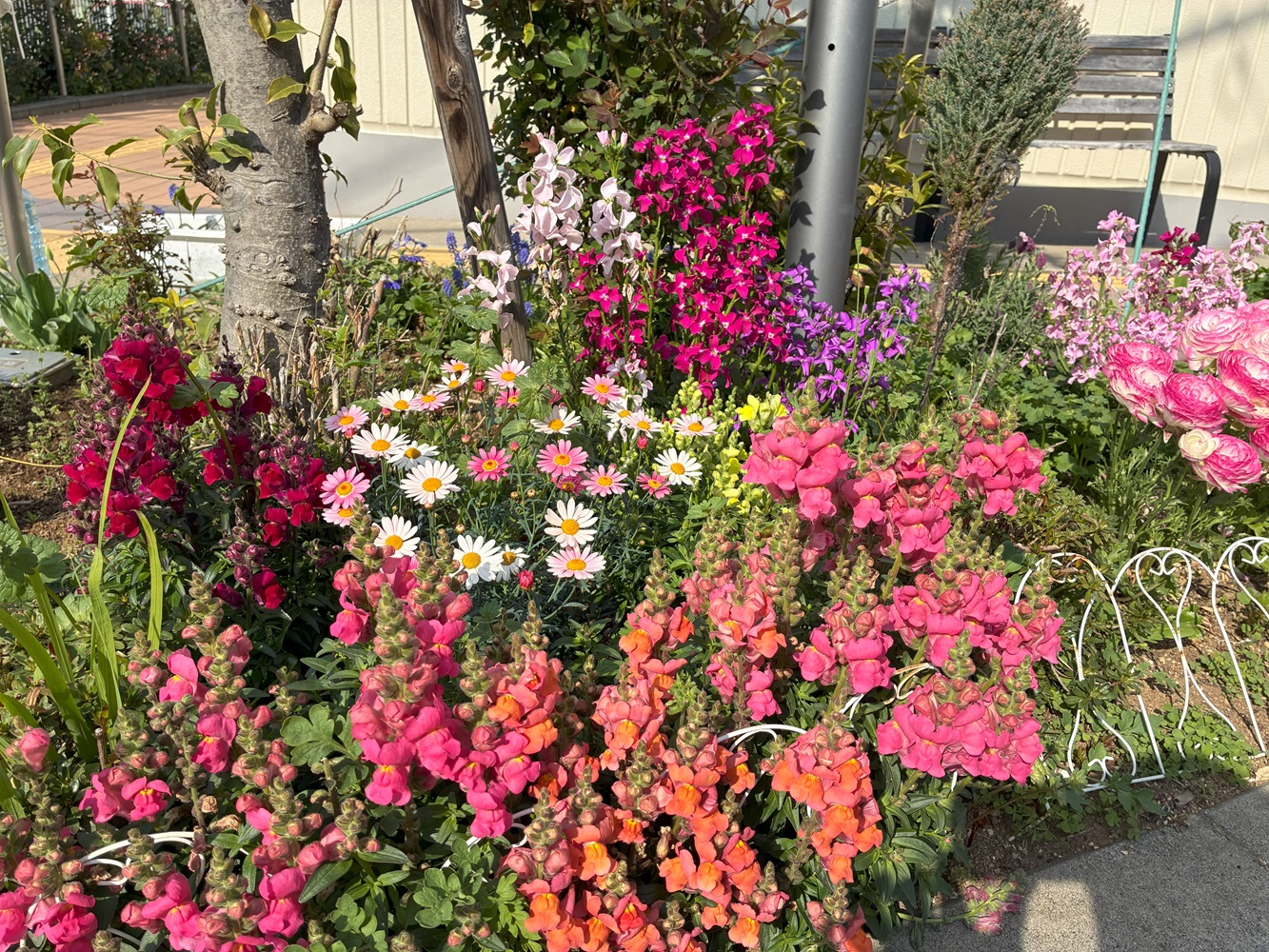 玄関前の花壇では、色とりどりのかわいらしい花が咲き誇っています。