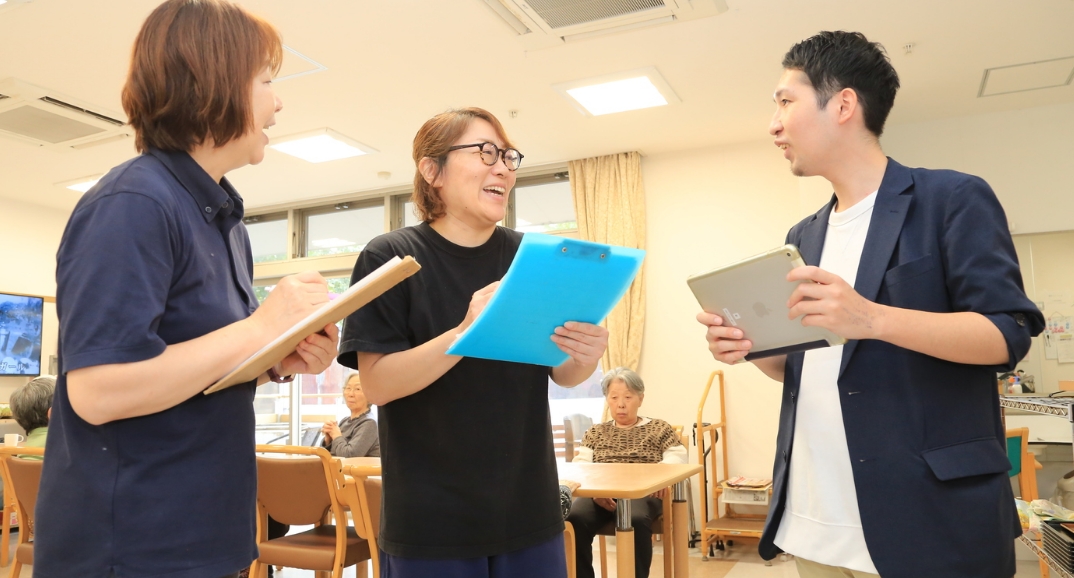 現場の気づきはすぐ共有。困った時は誰かが必ず手を差し伸べます。小さな「できた」を積み重ね、利用者さまの笑顔をいっしょに増やしていきましょう。